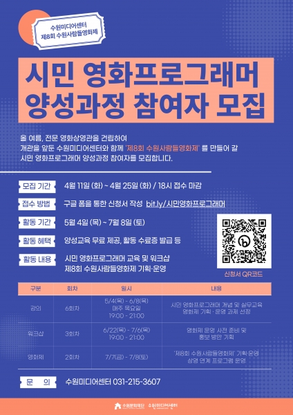 서류 심사를 거쳐 최종 10명을 선발할 예정이며 참여자들은 5월부터 7월까지 수원사람들영화제 시민 영화프로그래머로 활동한다.