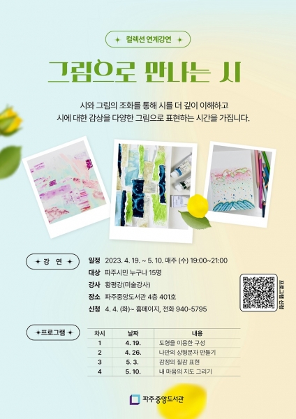 [금요저널] 파주중앙도서관은 4월 19일부터 5월 10일까지 매주 수요일 오후 7시 시화 강연 ‘그림으로 만나는 시’를 운영한다.