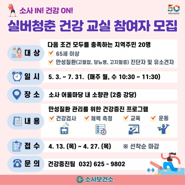 ‘실버청춘 건강 교실’은 두가지 조건을 모두 충족하는 지역주민을 대상으로 오는 5월부터 7월까지 주 2회진행한다.