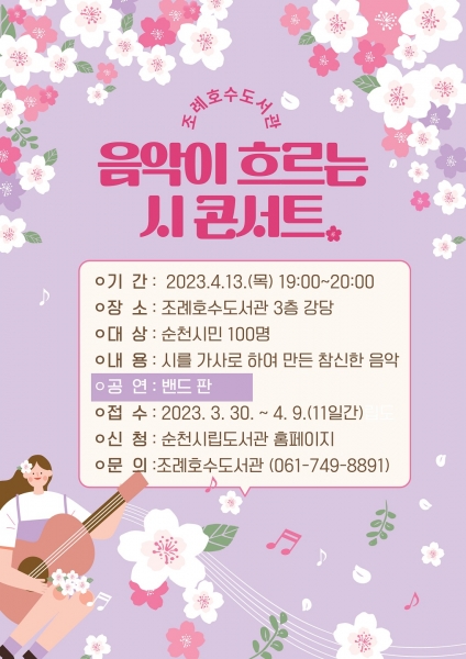 시 콘서트 접수는 순천시민 100명을 대상으로 하며 순천시립도서관 누리집에서 신청 가능하다.