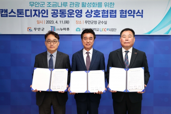 [금요저널] 전남 무안군은 11일 무안군청에서 무안군수, 목포대학교 LINC 3.0 이상찬 사업단장, ㈜누마루 김기원 대표가 참석한 가운데 무안군 조금나루 관광 활성화를 위한 창의적 종합 설계 공동 운영 협약을 체결했다.