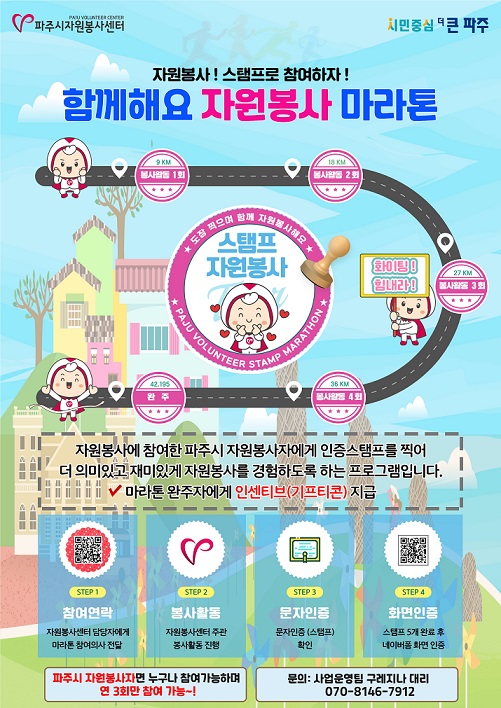 ‘함께해요 자원봉사 마라톤’은 봉사자들이 봉사활동을 하며 성취욕과 재미를 느낄 수 있도록 봉사와 마라톤을 접목한 프로그램으로 파주시자원봉사센터에서 주관하는 5번의 봉사활동을 완료하는 완주자에게 소정의 인센티브를 제공한다.