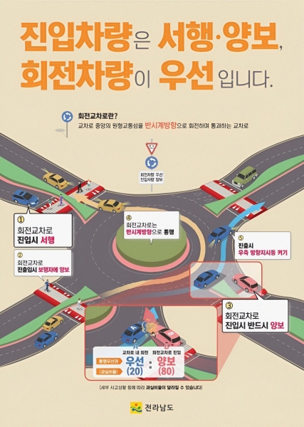 전남도는 2020년 신호등을 운영하기 어렵거나 교통량이 적지만 사고가 잦은 16곳에 회전교차로를 설치했다.