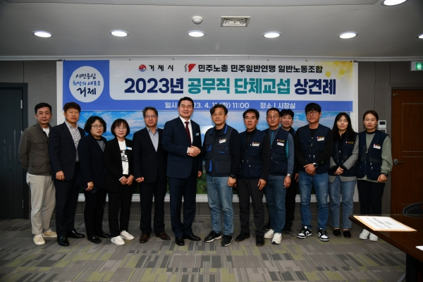 [금요저널] 거제시는 지난 11일 시장실에서 민주노총 거제시공무직지회와 2023년 임금 및 단체교섭을 위한 상견례를 개최했다.