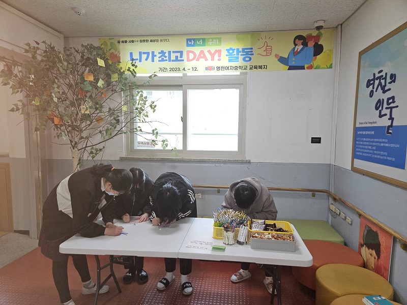 □ 영천여자중학교(교장 김경숙)는 나 너 우리 니가 최고 DAY!를 4월 12일 수요일 점심시간을 이용하여 학생들 간의 친구 관계 증진 및 칭찬문화 만들기를 위한 칭찬 릴레이를 하였다. 칭찬 릴레이는 4월을 시작으로 12월까지 운영하는 연중행사로 매월 둘째주(칭찬 주간) 실시한다.