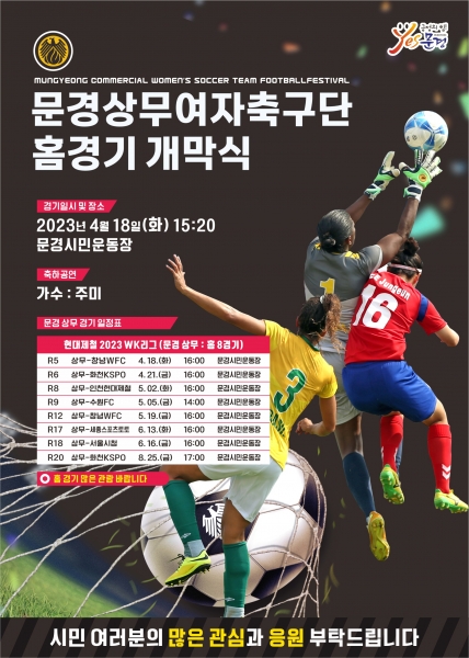 올해부터 새롭게 문경시로 연고지를 이전한 국군체육부대 상무여자축구팀은 지난 3월 24일 시작된 ‘현대제철 2023 WK리그’부터 “문경 상무”로 출전하고 있으며 오는 4월 18일은 문경 상무가 문경시에서 처음으로 치루는 홈경기로서 오후 3시부터 육군 의장대의 화려한 공연을 시작으로 선수들의 사인볼 증정을 거쳐 오후 4시부터 창녕WFC와의 역사적인 홈경기 개막전을 치를 예정이며 하프타임에는 미스트롯 출신의 인기가수 주미의 신나는 축하공연도 마련되어 있다.