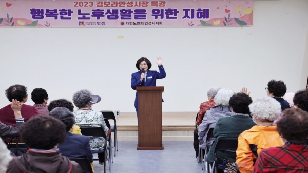 [금요저널] 김보라 안성시장은 지난 12일 대한노인회 안성시지회 부설 안성 노인대학 대강당에서 수강생 90명을 대상으로 ‘행복한 노후생활을 위한 지혜’ 특강을 실시했다.
