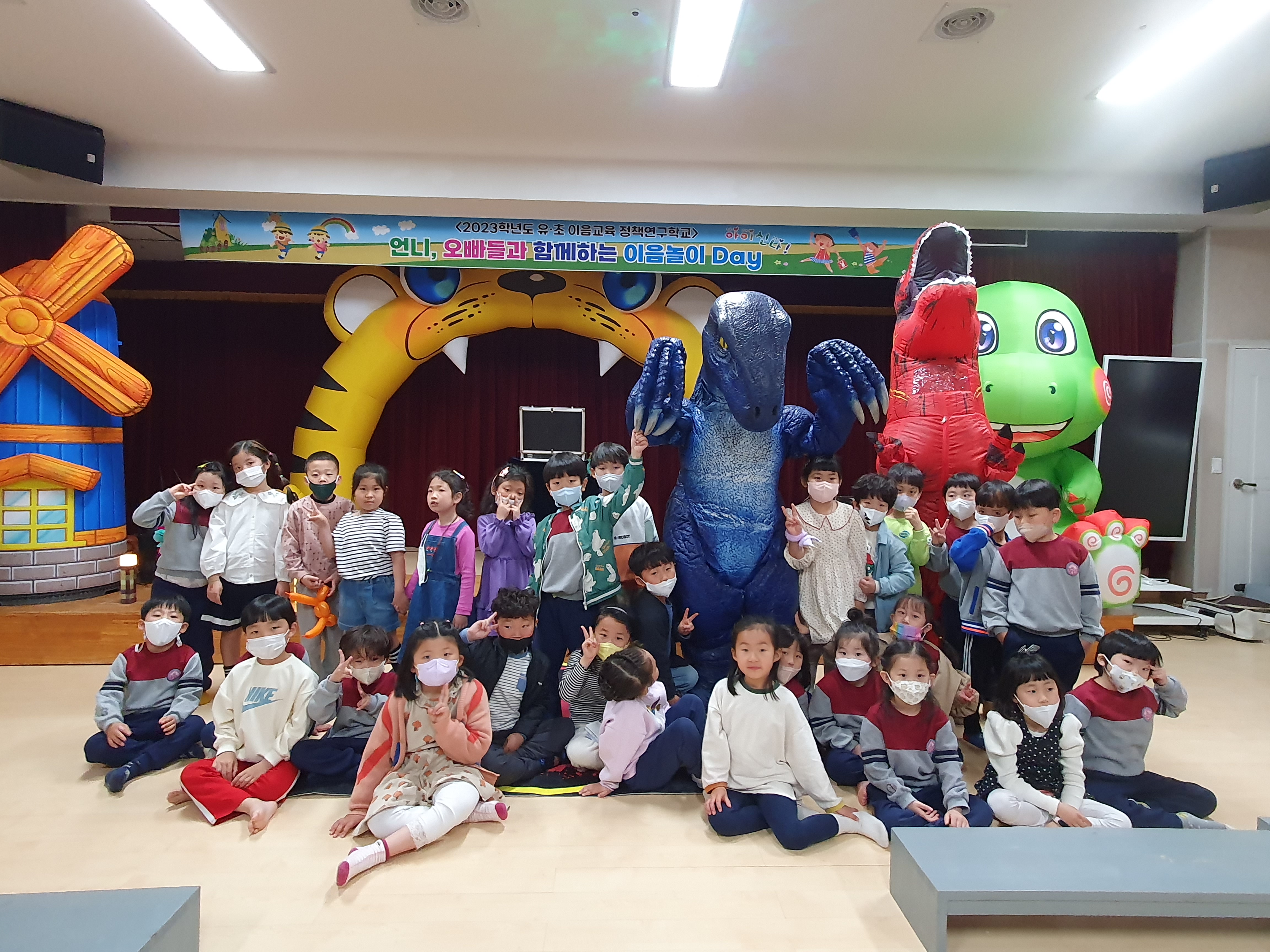 □‘언니, 오빠들과 함께하는 이음놀이 Day’는 유·초 연계를 위하여 인근 지역 대동초등학교 학생들을 유치원 교실에 초청하여 초등학교 생활에 대한 궁금증을 나누고, 초등학생과 함께 ‘머그컵 만들기’와 ‘공룡패밀리’ 인형극을 관람하며 형님-아우 띠앗 놀이로 우정을 나눌 수 있는 장이 되었다. 유아들은“초등학교에 다니는 언니, 오빠들을 알게 되어서 너무 좋아요. 앞으로 또 만나고 싶어요.”라고 소감을 말하였다.