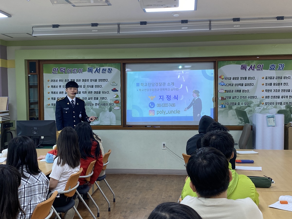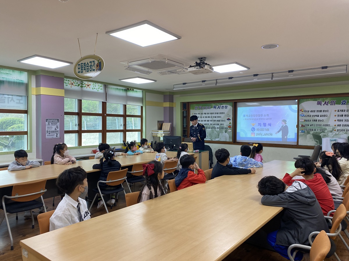 □ 안덕초등학교(교장 오정선)는 4월 14일(금)에 초등학교 학생들을 대상으로 학교전담경찰관이 학교를 방문하여‘학교폭력전담경찰관교육’을 도서관에서 실시하였다. 이번 교육은 학생들의 학교폭력에 대한 올바른 의식과 대응 역량을 길러주며 적극적 예방자로 육성하여 학교폭력문제를 자율적으로 해결하는 능력을 기르고자 실시하였다.