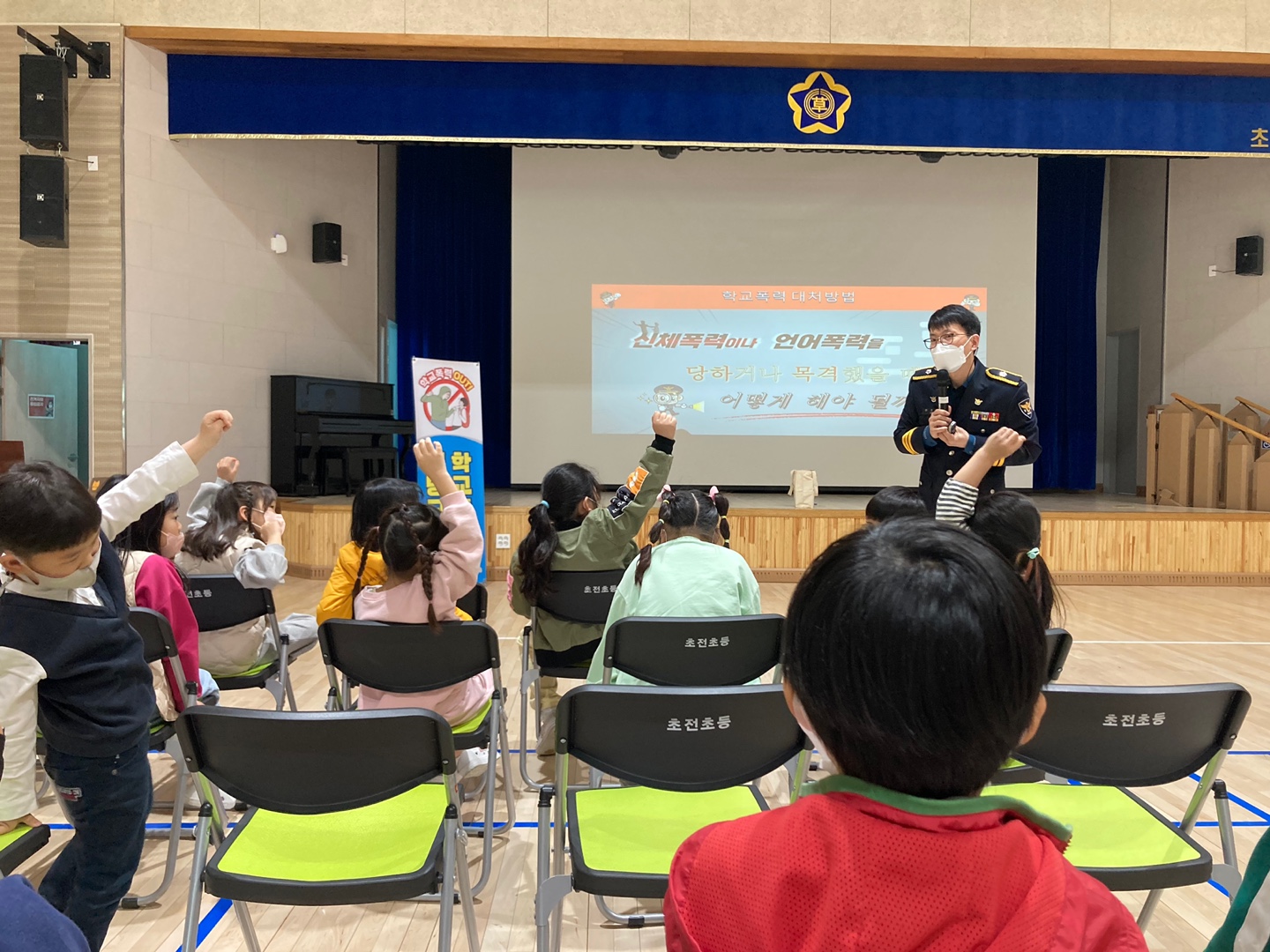 □ 초전초등학교(교장 김동섭)는 4월 13일(목) 본교 강당에서 ‘신체폭력, 언어폭력’이라는 주제로 2023학년도 1학기 학교폭력예방교육을 실시하였다. 이번 교육은 1~3학년 저학년 학생들을 대상으로 진행되었다.