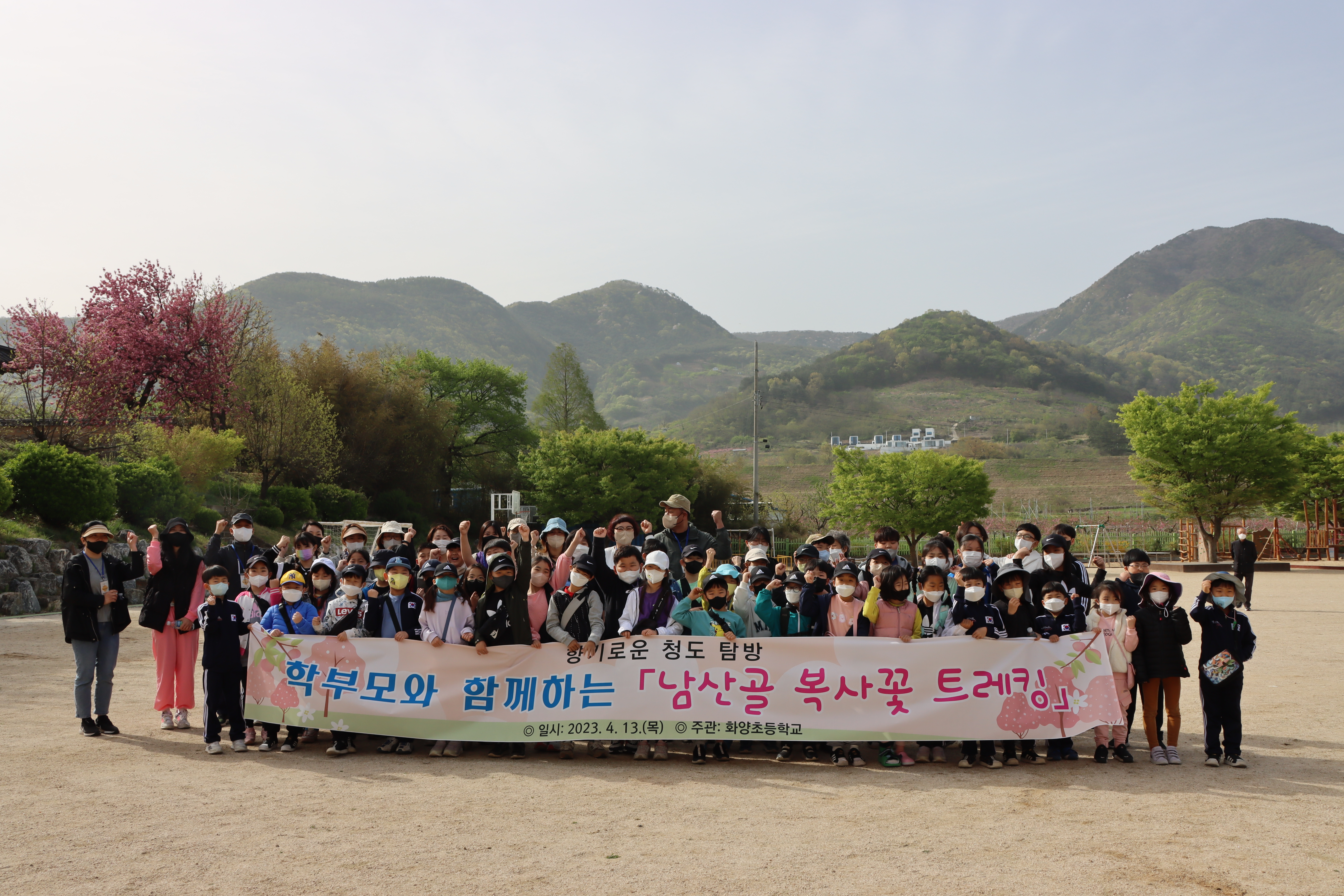 화양초등학교는 우리 고장 문화를 직접 탐방하며 고장 사랑 정신을 함양하고 체력 단련 및 인내심을 키우기 위해 복사꽃이 아름다운 4월에 사제동행 복사꽃 트레킹을 실시하고 있다. 특히 이번 트레킹에서는 4년만에 학부모도 함께 참여해 아이들과 함께 이야기를 나누며 걷는 소중한 시간을 가졌다.