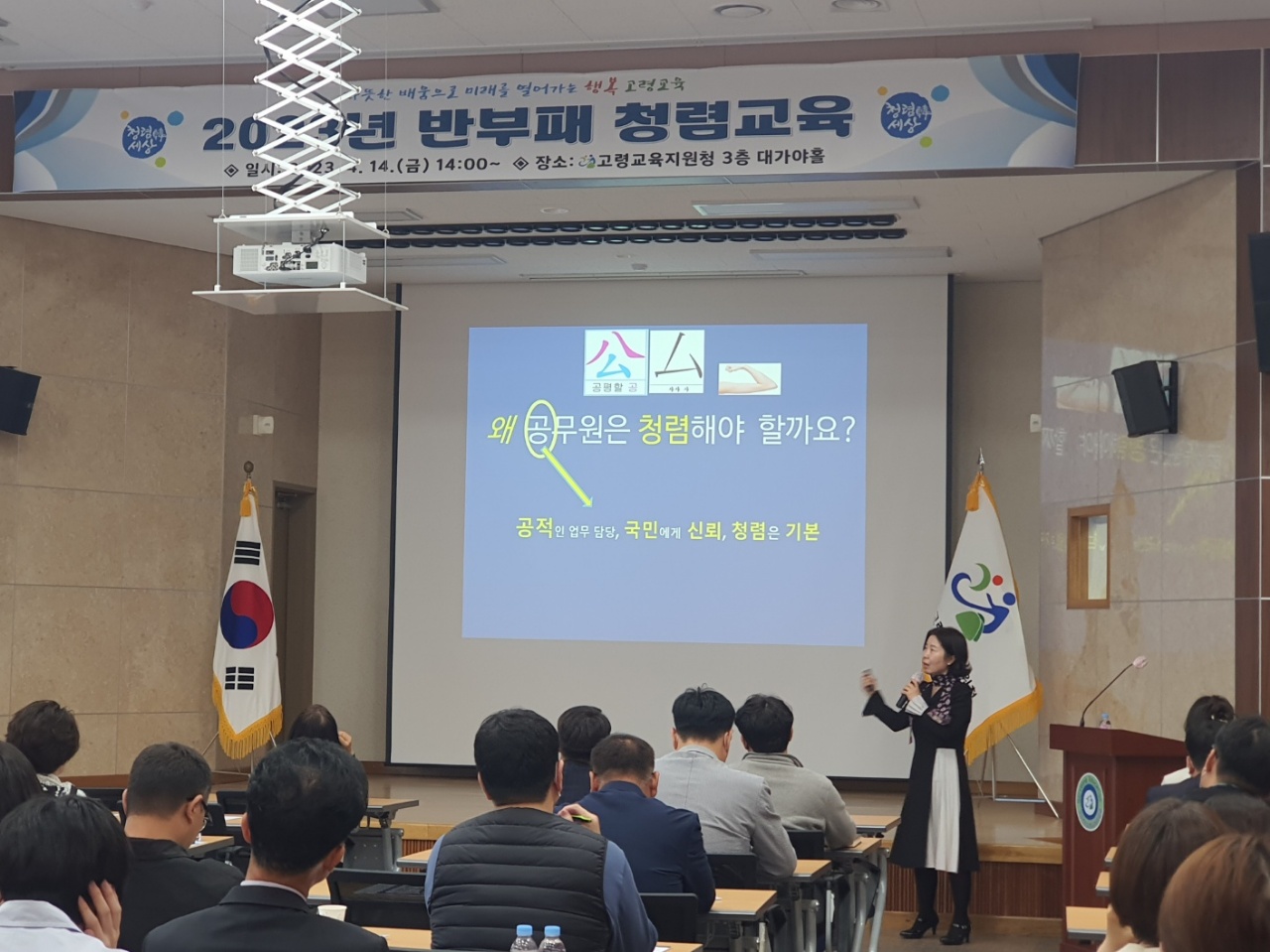 고령교육지원청(교육장 기세원)은 4월 14일(금) 청 내 대가야홀에서 관내 초·중학교 교장 및 행정실장, 교육지원청 직원을 대상으로 공정하고 깨끗한 청렴 문화 정착을 위한 청렴 교육을 실시했다.