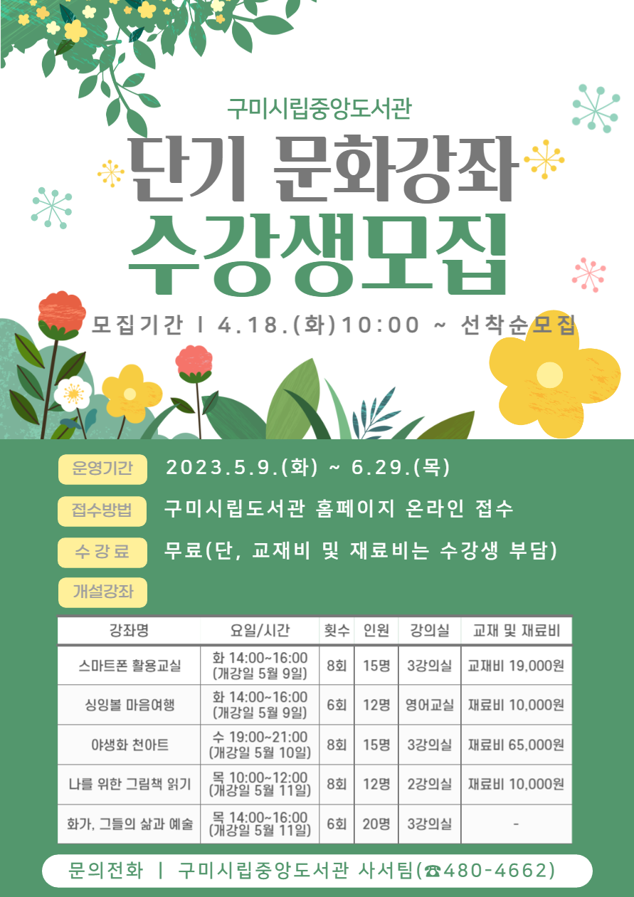 상반기 단기 문화강좌는 구미시민 누구나 신청 가능하며 ▲스마트폰 활용교실 ▲싱잉볼 마음여행 ▲야생화 천아트 ▲나를 위한 그림책 읽기 ▲화가 그들의 삶과 예술 5개 강좌로 구성되어 있으며 5월 9일부터 시작해 8주간 운영된다.