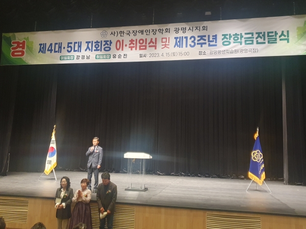 행사 1부는 한국장애인장학회 광명시지회 발전에 헌신한 제4대 강경남 회장에 대한 감사패 전달과 제5대 유순진 신임회장의 취임사가 이어졌다.