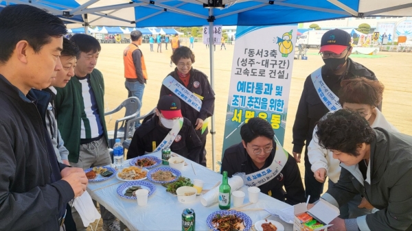 이날 면장 및 면직원들은 행사장을 직접 찾아가 총동창회에 참석한 동문들에게 ‘동서3축 성주~대구간 고속도로 건설’에 대한 사업 설명 및 사업 추진의 당위성을 피력하고 예비타당성조사의 조속한 통과로 조기에 사업이 추진될 수 있도록 서명운동에 적극 참여해 줄 것을 독려했다.
