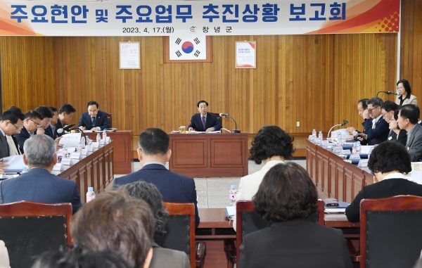[금요저널] 창녕군은 17일 군청 대회의실에서 부서별 주요현안 및 주요업무 추진상황 보고회를 개최했다.
