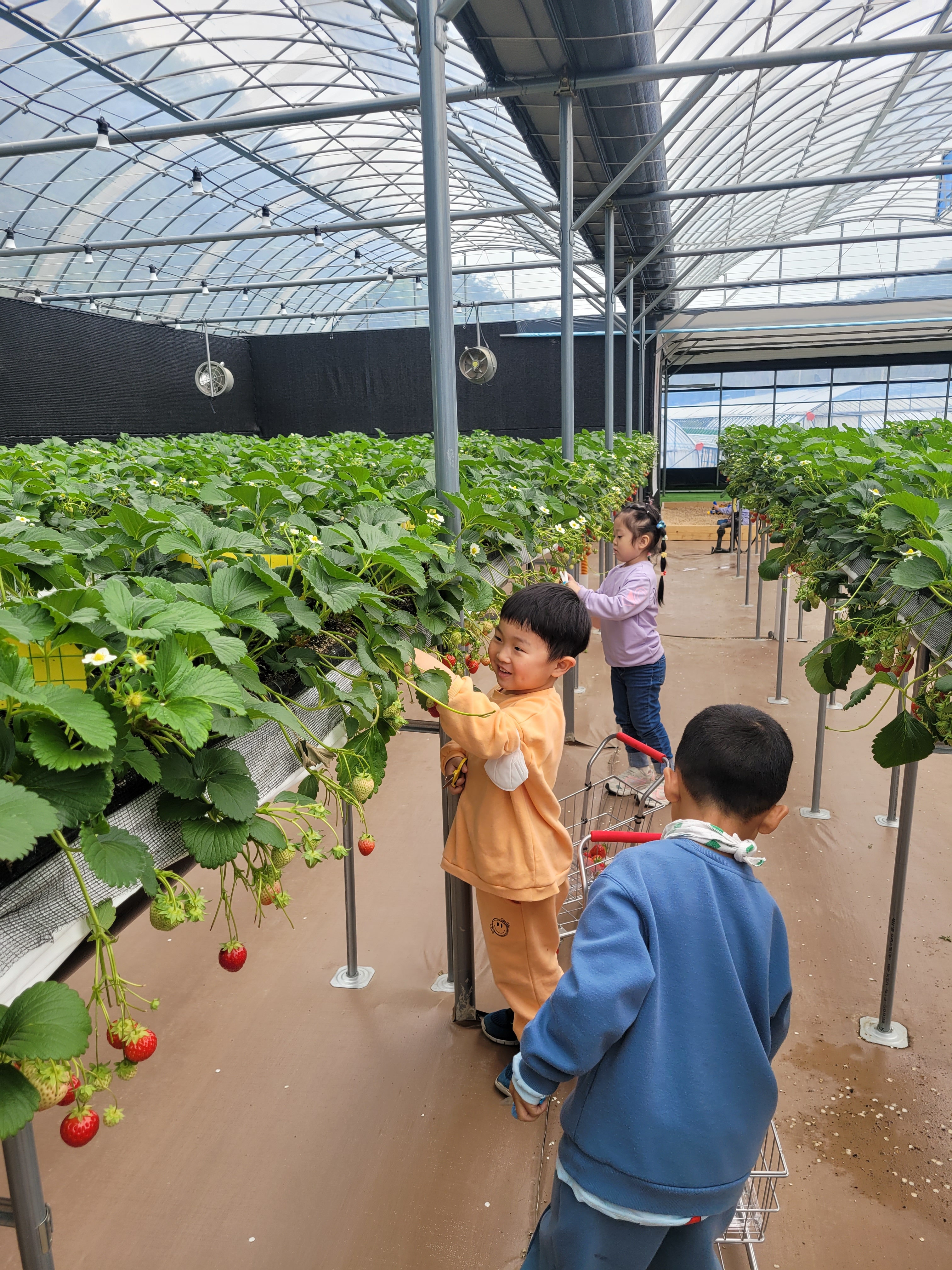 ▣ 딸기 농원에 도착한 유아들은 딸기꽃 관찰하기, 딸기의 색깔, 성장과정 등에 대해 알아본 후 6동으로 연결된 넓은 하우스 안으로 들어가 딸기따기용 가위로 딸기 줄기를 잘라 어린이용 카트기에 딸기를 직접 담아보았다.