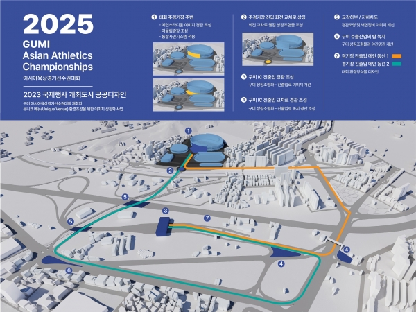 ‘2023 국제행사 개최도시 공공디자인’사업은 문화체육관광부에서‘국제문화예술행사 개최도시 시각이미지 개선’이라는 사업으로 추진되던 공모사업이었으나 올해 처음으로 지원 대상이 국제체육행사까지 포함되어 추진됐고‘2025 아시아육상경기선수권대회’개최 도시인 구미시는 해당 공모에 적극 대응한 결과 국비 9.5억원을 최종 확보했다.