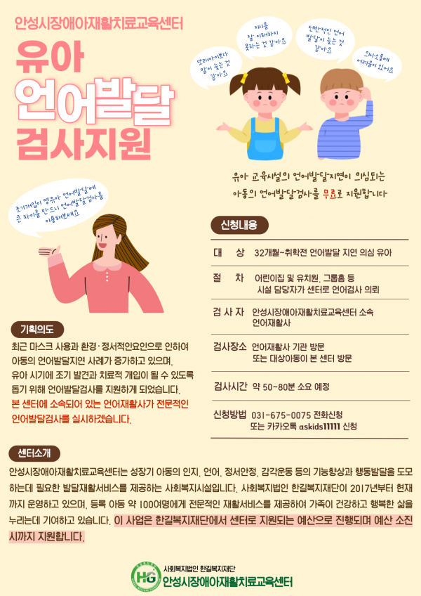[금요저널] 안성시장애아재활치료교육센터에서는 언어발달 지연이 의심되는 32개월 이상 취학 전 유아를 대상으로 언어발달 검사를 예산 소진시 까지 무료로 진행한다.