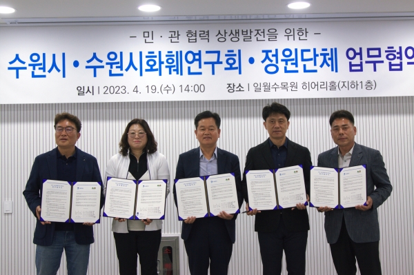 수원시는 19일 일월수목원 히어리홀에서 수원시화훼연구회, 정원단체와 ‘화훼 생산품 유통 활성화 업무협약’을 체결했다.