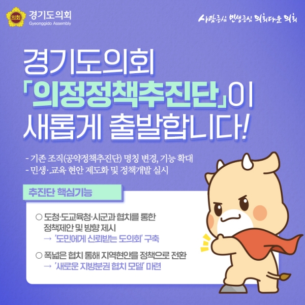 [금요저널] 경기도의회가 의회 차원의 주요 정책을 발굴하고 추진하기 위해 도의원 의정활동 지원조직인 ‘의정정책추진단’을 본격 가동한다.