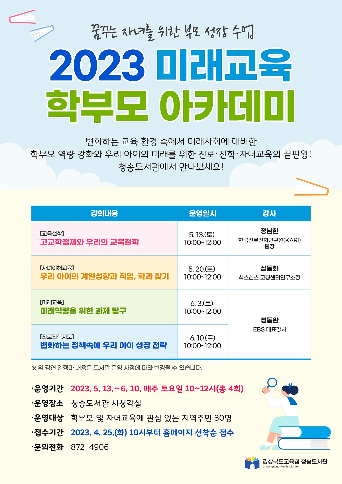 □ 경상북도교육청 청송도서관(관장 김미연)은 4월 25일(화)부터 학부모의 올바른 교육관을 정립하고 자녀교육 역량을 강화하기 위해 ‘2023년 미래교육 학부모 아카데미’ 수강생을 모집한다.