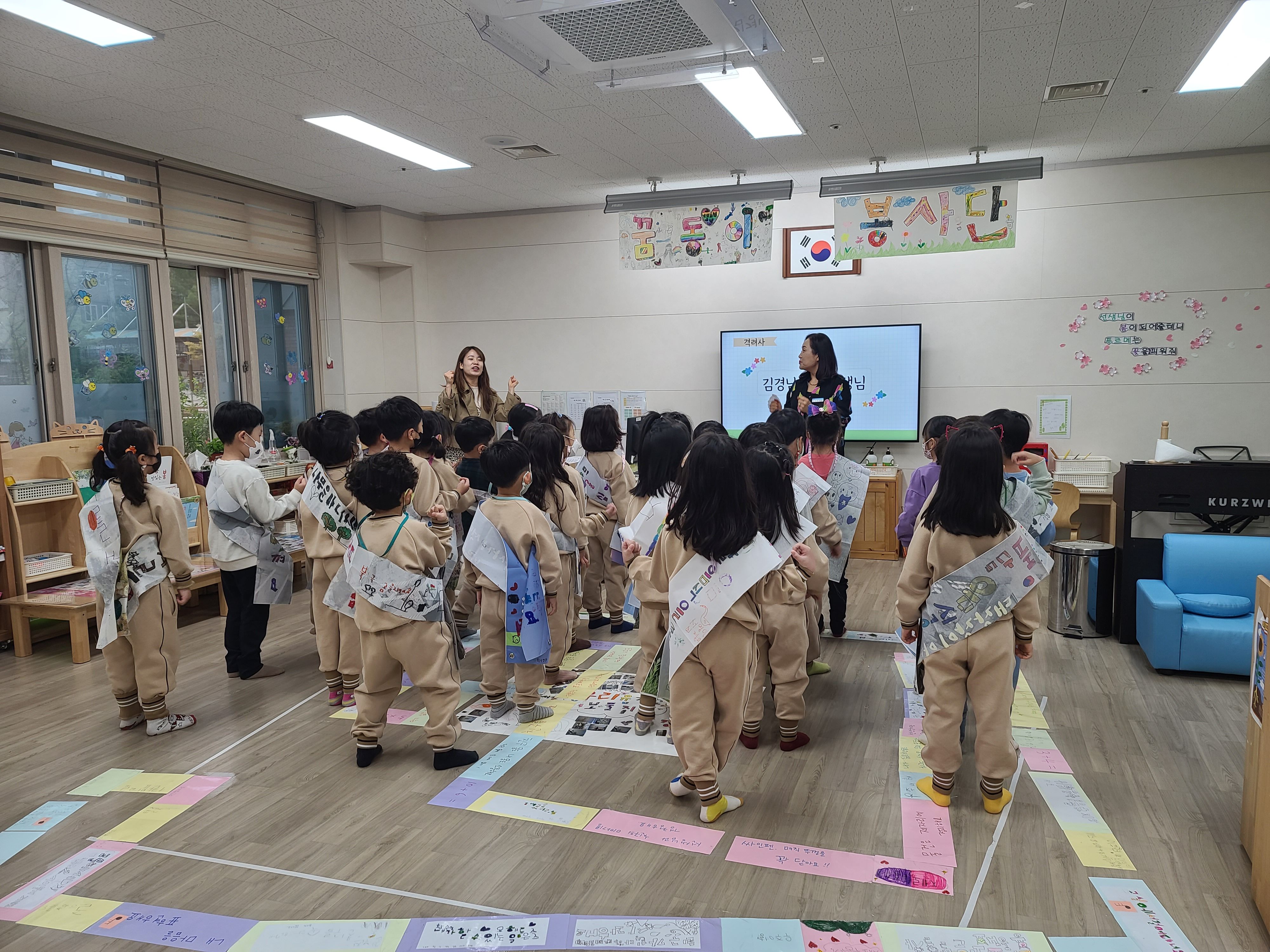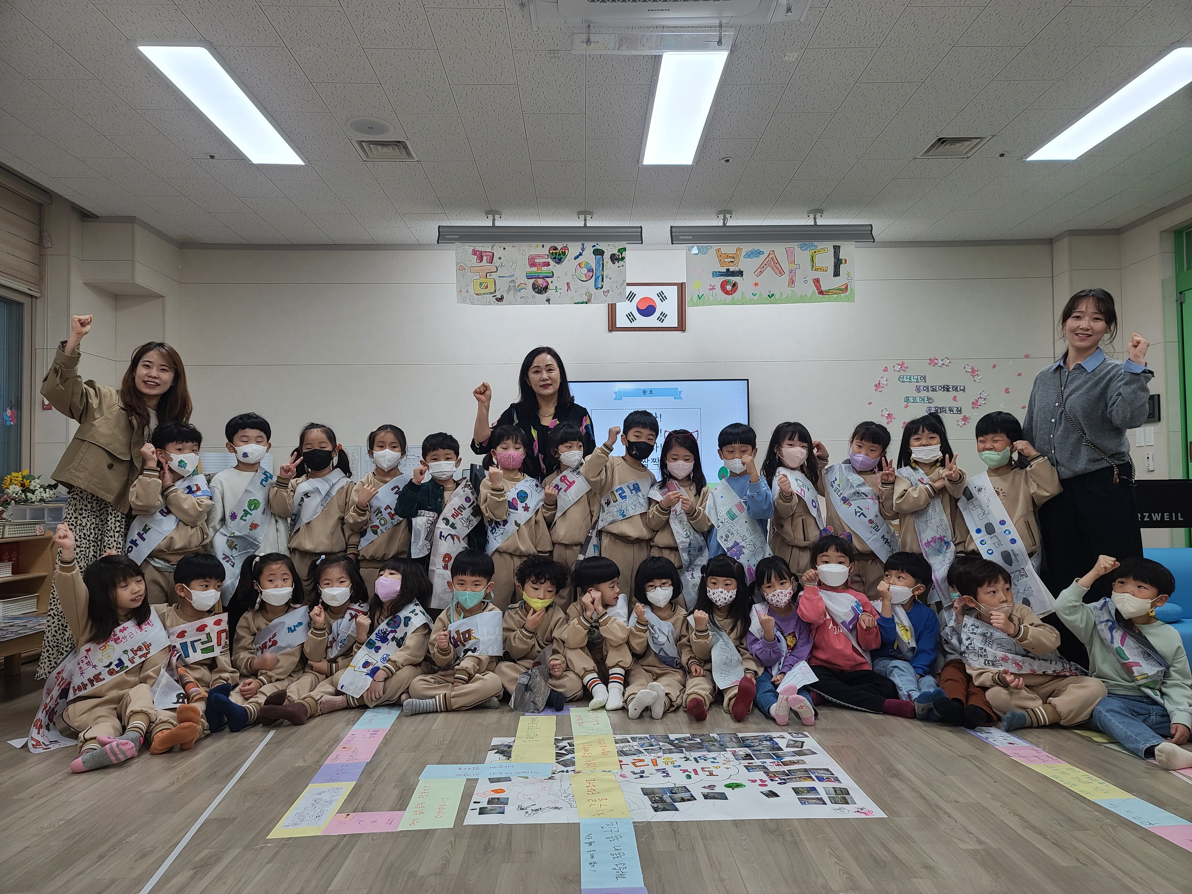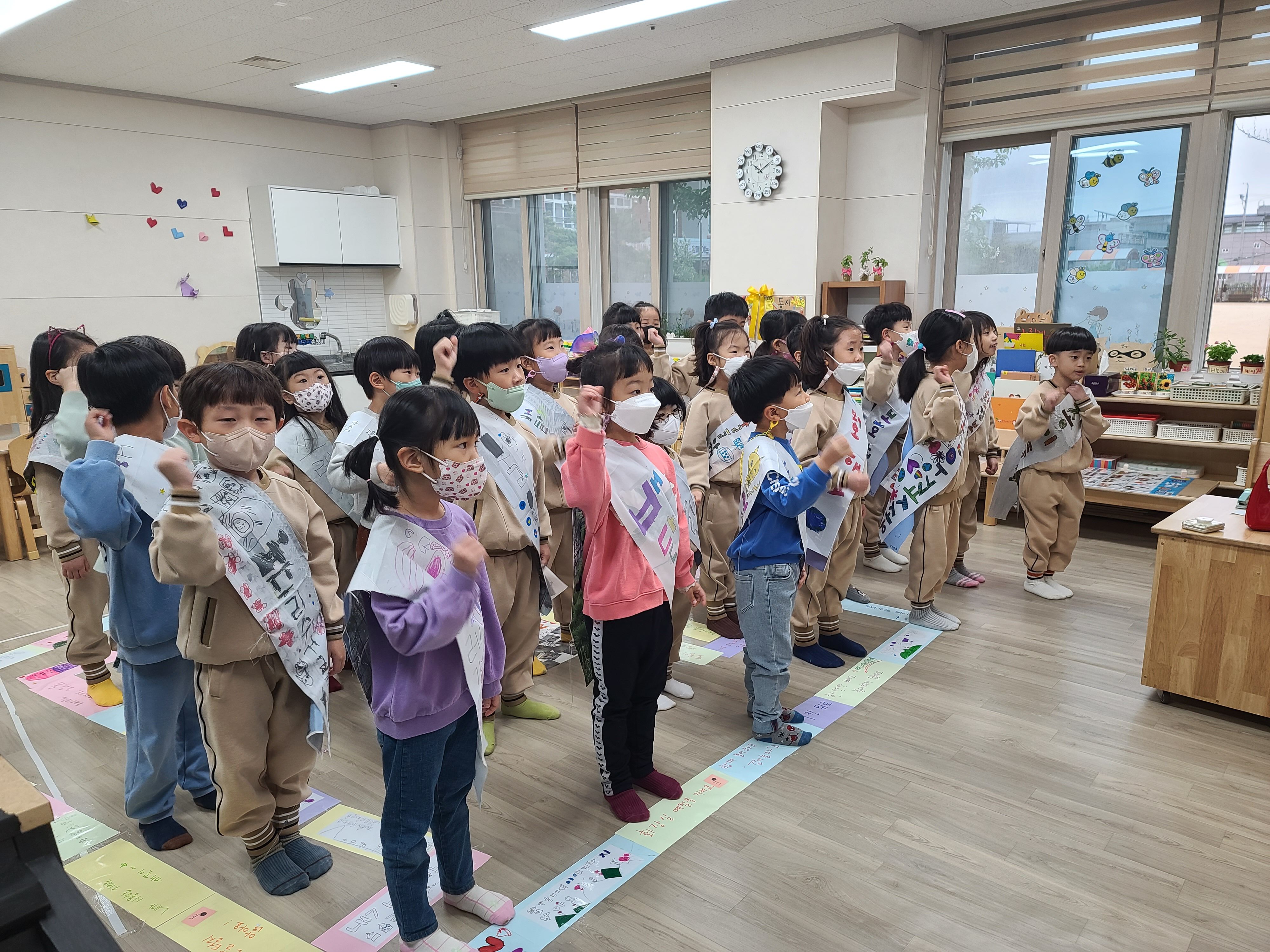 □ 발대식을 마친 후 대원들은 “신나게, 사이좋게, 내 힘으로” 구호를 제창하며 어떤 일이든 스스로 문제를 해결하는 힘을 기를 것을 다짐하였으며,「지구를 보호해요」「나무를 자르지 마세요」하고 쓰여진 피켓과 어깨띠를 두르고 우천관계로 유치원내 봉사활동을 하였다.