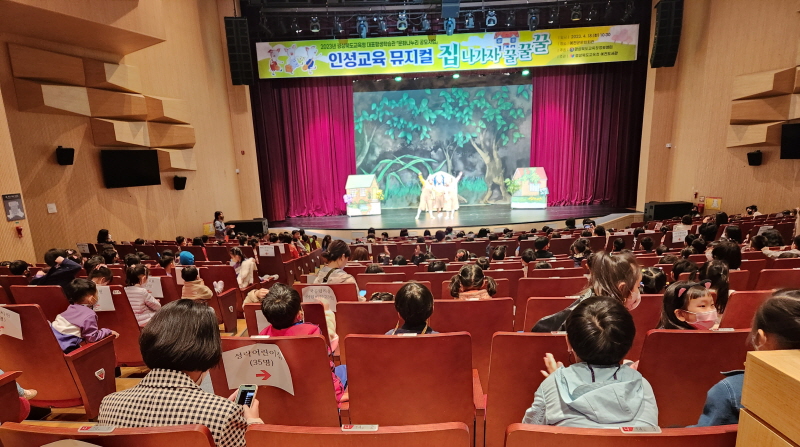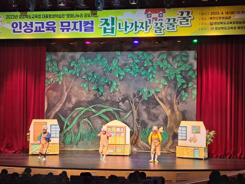 경상북도교육청 예천도서관(관장 김정연)은 18일 예천군문화회관에서 예천지역 5~7세 유아 370명을 대상으로 「집 나가자 꿀꿀꿀」 인성교육 뮤지컬을 공연해 폭발적인 인기를 얻었다.