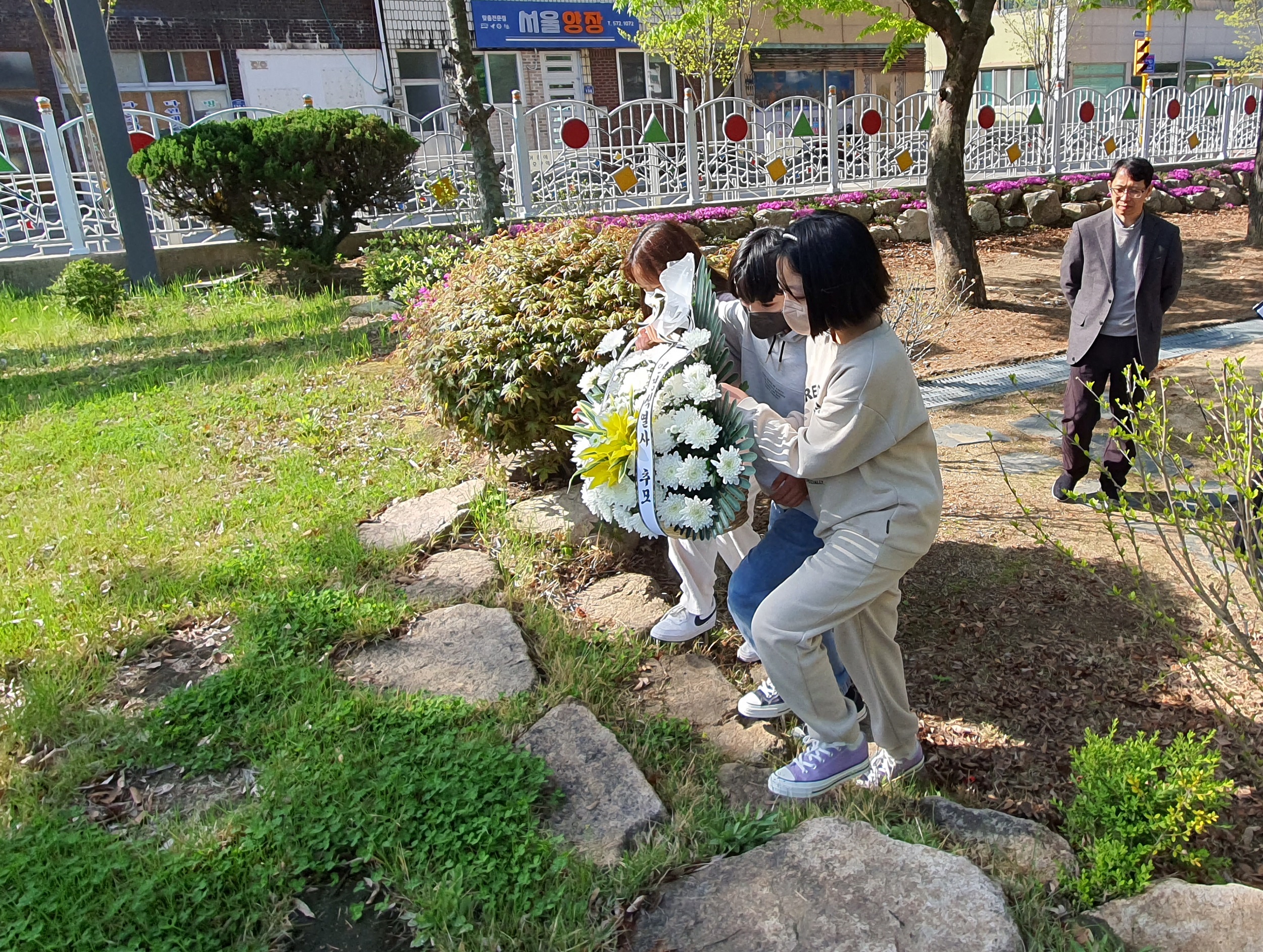 □ 가은초등학교(교장 최을희)는 4월 19일(수) 4·19혁명 63주년을 맞이하여 교내에 있는 四월혁명 안경식군 순국추모비 앞에서 전교학생회 임원들이 대표로 4·19혁명 기념 및 추모식을 거행하였다.