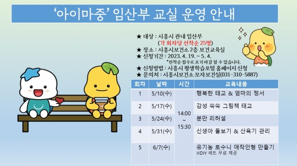 신청 기간은 4월 20일부터 5월 4일까지이며 시흥시 평생학습포털 누리집 신청 또는 보건소 모자보건실로 신청하면 된다.