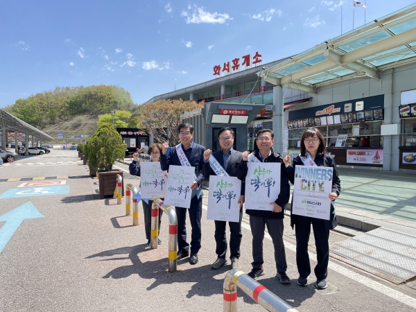 [금요저널] 상주시 화서면에서는 4월 19일 속리산휴게소, 화서휴게소에서 직원 10여명이 대구 군사시설 통합이전 유치를 위한 홍보 활동을 펼쳤다.