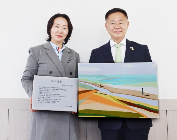 김재욱 칠곡군수는 먼발치에서 시각장애인 아들을 바라보는 어머니의 모습을 표현한 작품 ‘엄마의 마음’을 장애인 부모회 칠곡군지부에 전달했다.