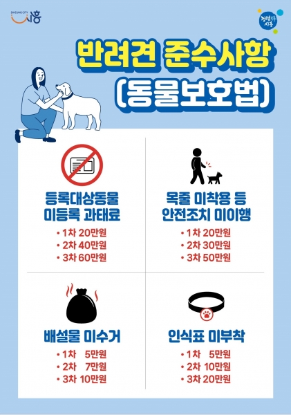 시 관계자는 “반려견을 사랑하는 만큼, 동물보호법에 관심을 갖고 이를 준수해 동물복지 문화 조성에 앞서가는 시흥시가 되길 바란다”고 말했다.