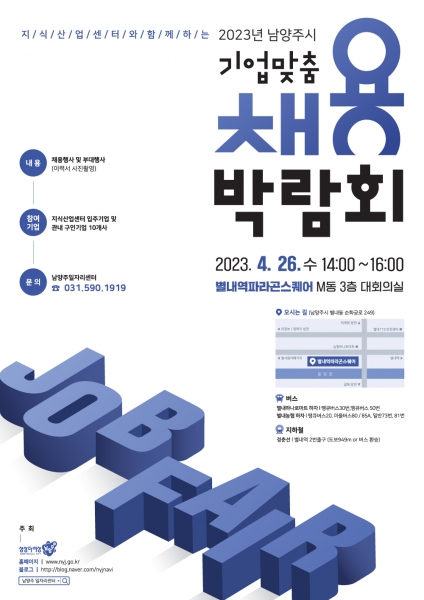 [금요저널] 남양주시는 오는 26일 별내동에 위치한 지식산업센터 별내역파라곤스퀘어 대회의실에서 지역 기업의 우수 인력 채용을 위한 ‘2023 기업 맞춤 채용 박람회’를 개최한다.