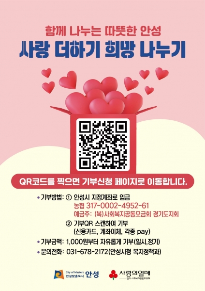 [금요저널] 안성시는 정부의 손길이 닿지 못하는 복지사각지대를 발굴해 취약계층의 삶의 질을 향상시키고 사회복지시설·단체의 내실 있는 이웃돕기가 추진될 수 있도록 기부문화 활성화 캠페인을 실시한다고 밝혔다.