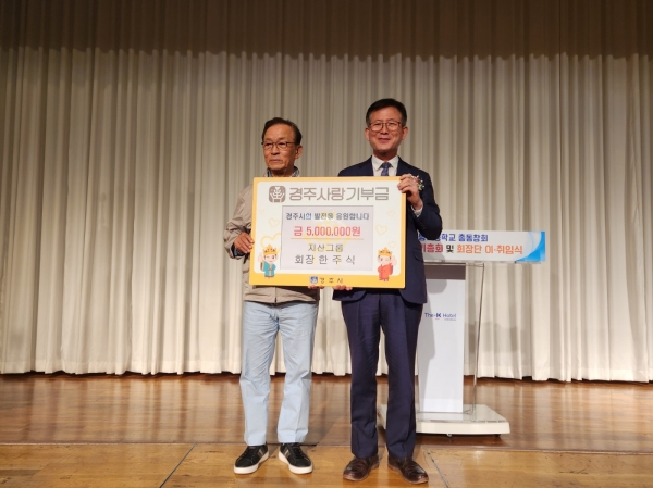 한 회장은 지난 22일 더케이호텔 경주에서 열린 사방초등학교 총동창회 제49차 정기총회 및 회장단 이·취임식 자리에서 경주사랑기부제 개인 연간 최대 금액인 500만원을 기부했다.