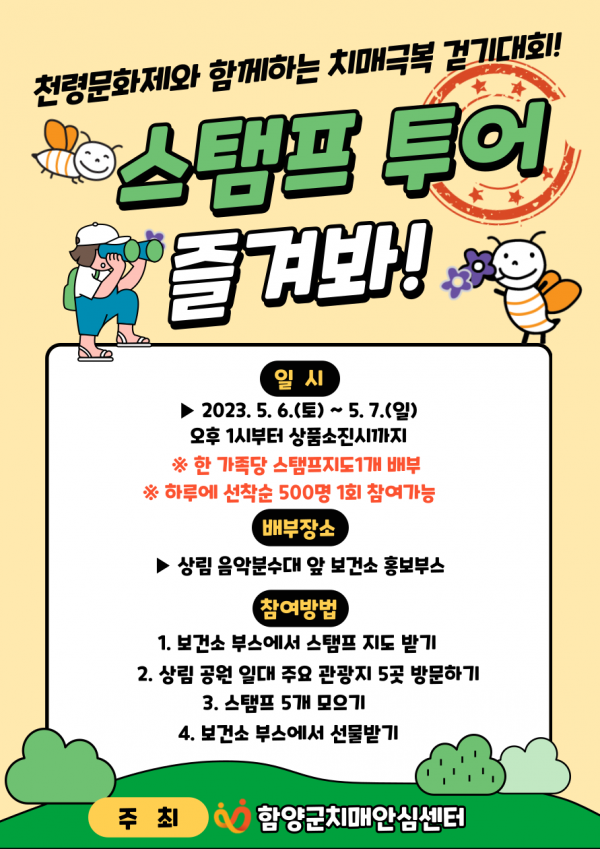 이번 함양군 치매극복걷기행사는‘즐겨봐, 스탬프투어’라는 주제로 실시되며 지역주민들과 행사방문객들이 지역축제와 걷기행사 모두를 즐길 수 있도록 천령문화제 기간에 준비하게 됐다.