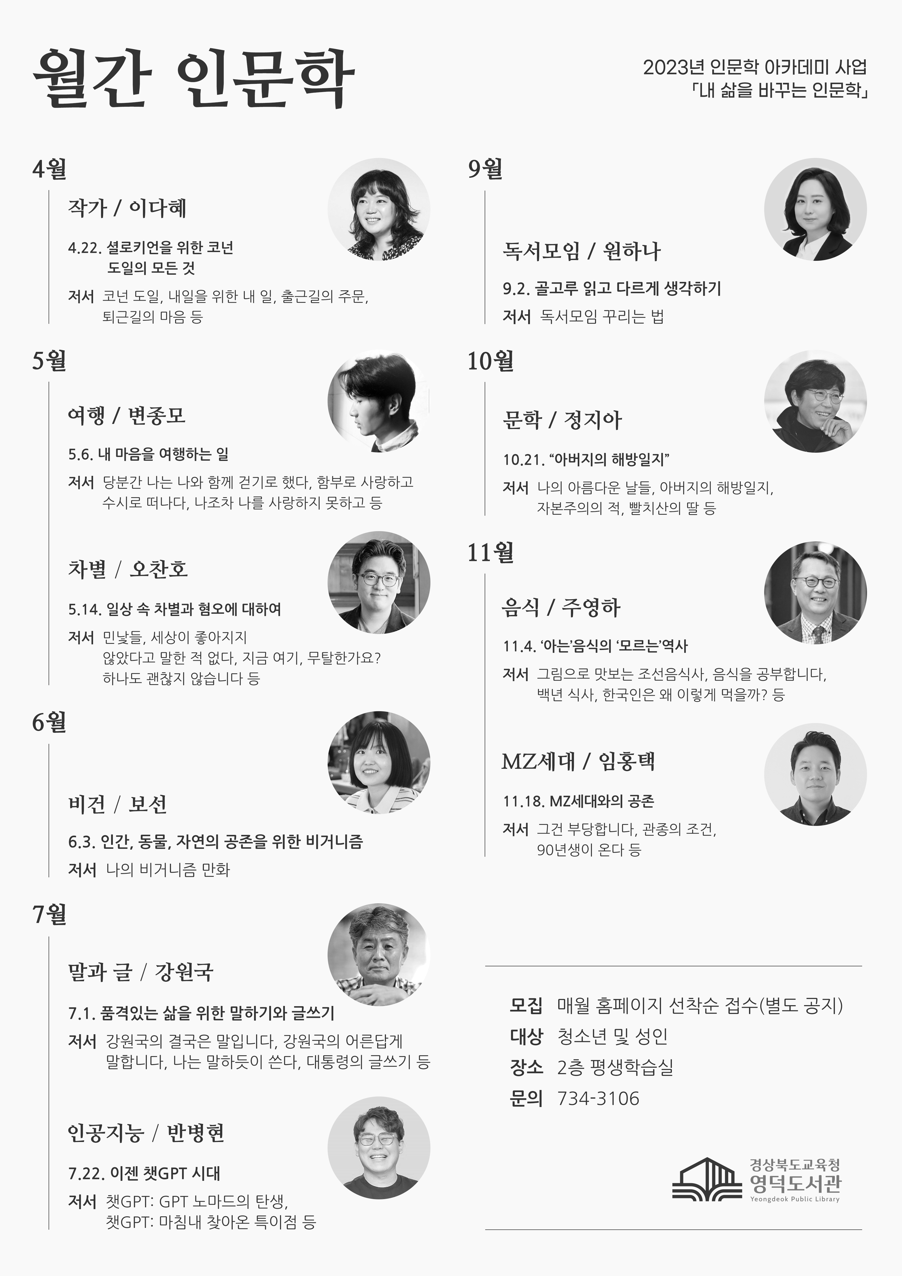 이다혜 작가의 강연을 시작으로 ▲ 변종모 작가 ‘내 마음을 여행하는 일’ ▲ 오찬호 작가 ‘일상 속 차별과 혐오에 대하여’ ▲ 보선 작가 ‘인간, 동물, 자연의 공존을 위한 비거니즘’ ▲강원국 작가 ‘품격있는 삶을 위한 말하기와 글쓰기’ ▲ 반병현 작가 ‘이젠 쳇GPT 시대’ ▲ 원하나 작가 ‘골고루 읽고 다르게 생각하기’ ▲ 정지아 작가 ‘아버지의 해방일지’ ▲ 주영하 교수 ‘아는 음식의 모르는 역사’ ▲ 임홍택 ‘MZ세대와의 공존’ 인문학 강연을 운영할 예정이다.
