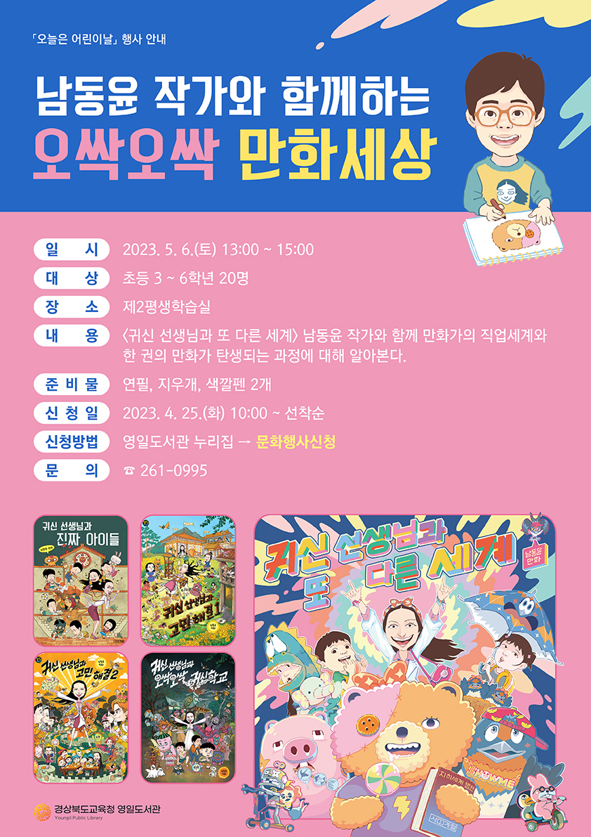 □ 경상북도교육청 영일도서관(관장 이영분)은 어린이날을 맞아 5월 6일(토) 13시 지역 내 초등 3~6학년 어린이를 대상으로‘남동윤 작가와 함께하는 오싹오싹 만화세상’을 운영한다.