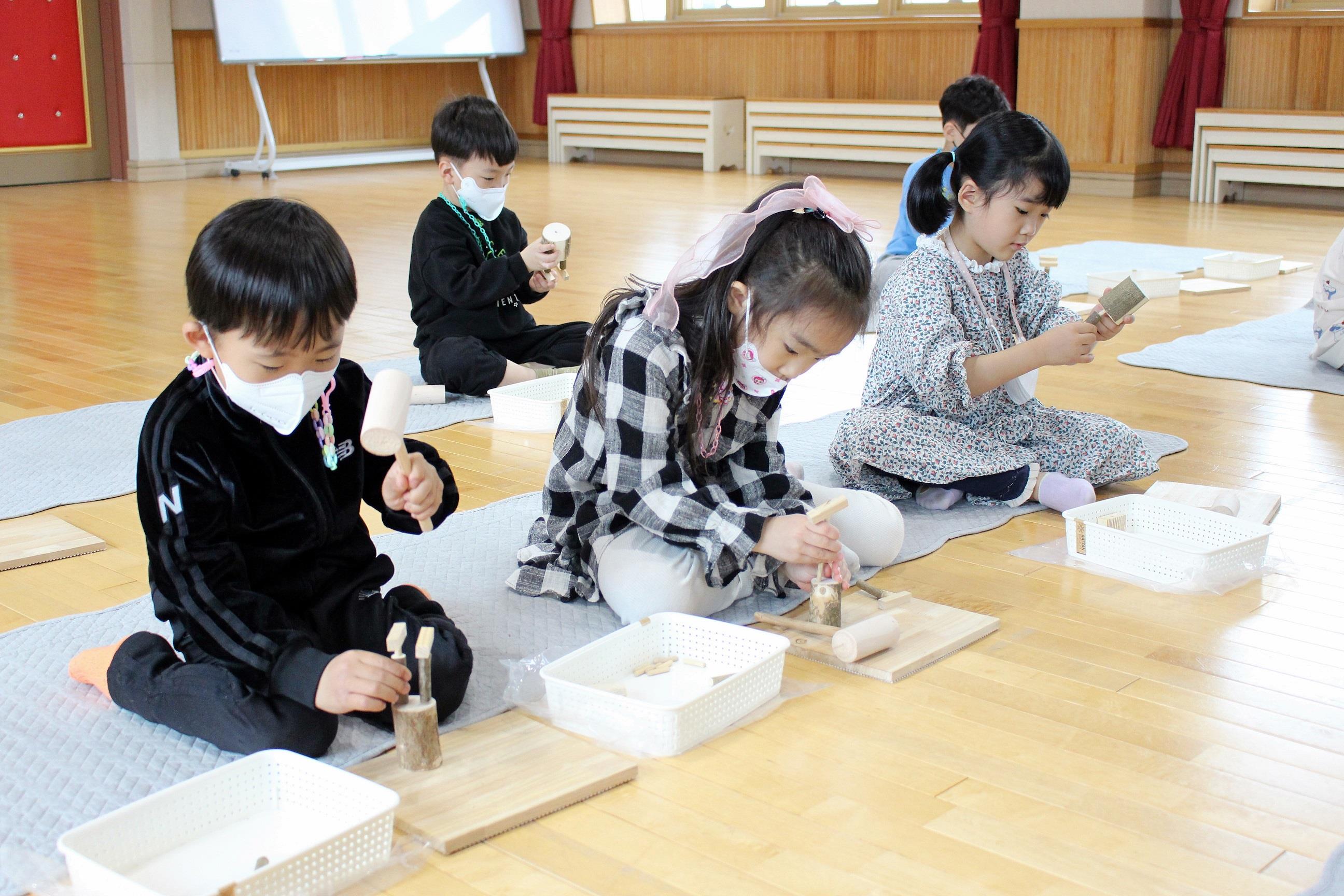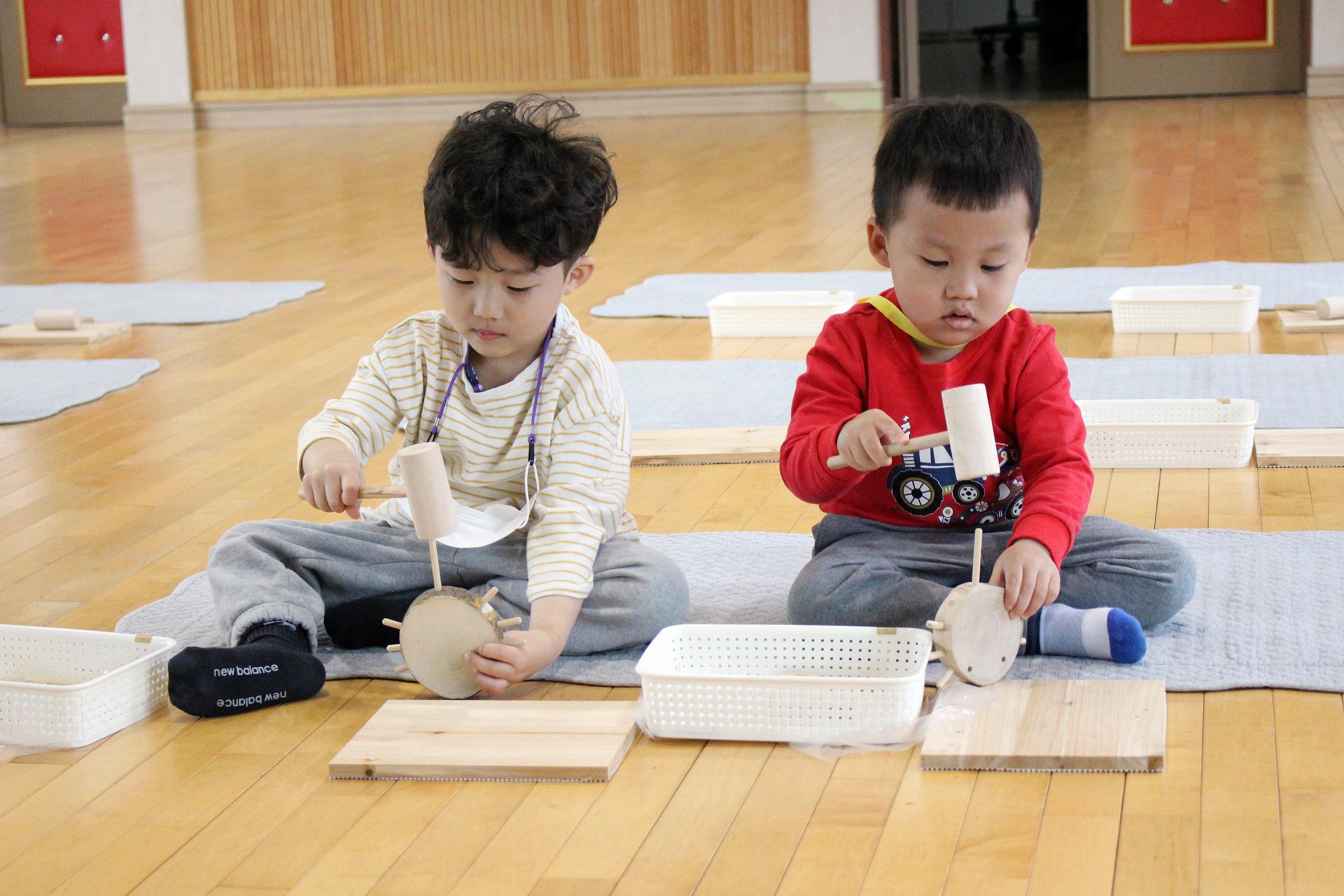 □ 유아들은 목공놀이 시 지켜야 할 안전 약속을 함께 이야기 나눈 후 목공놀이 도구의 이름을 알아가면서 연령별로 발달 수준에 적합한 목공놀이를 진행하였다. 만 3세반은 ‘무당벌레’, 만 4세 반은 ‘기린’, 만 5세반은 ‘변신 로봇’을 만들면서 즐거운 체험시간을 가졌다.