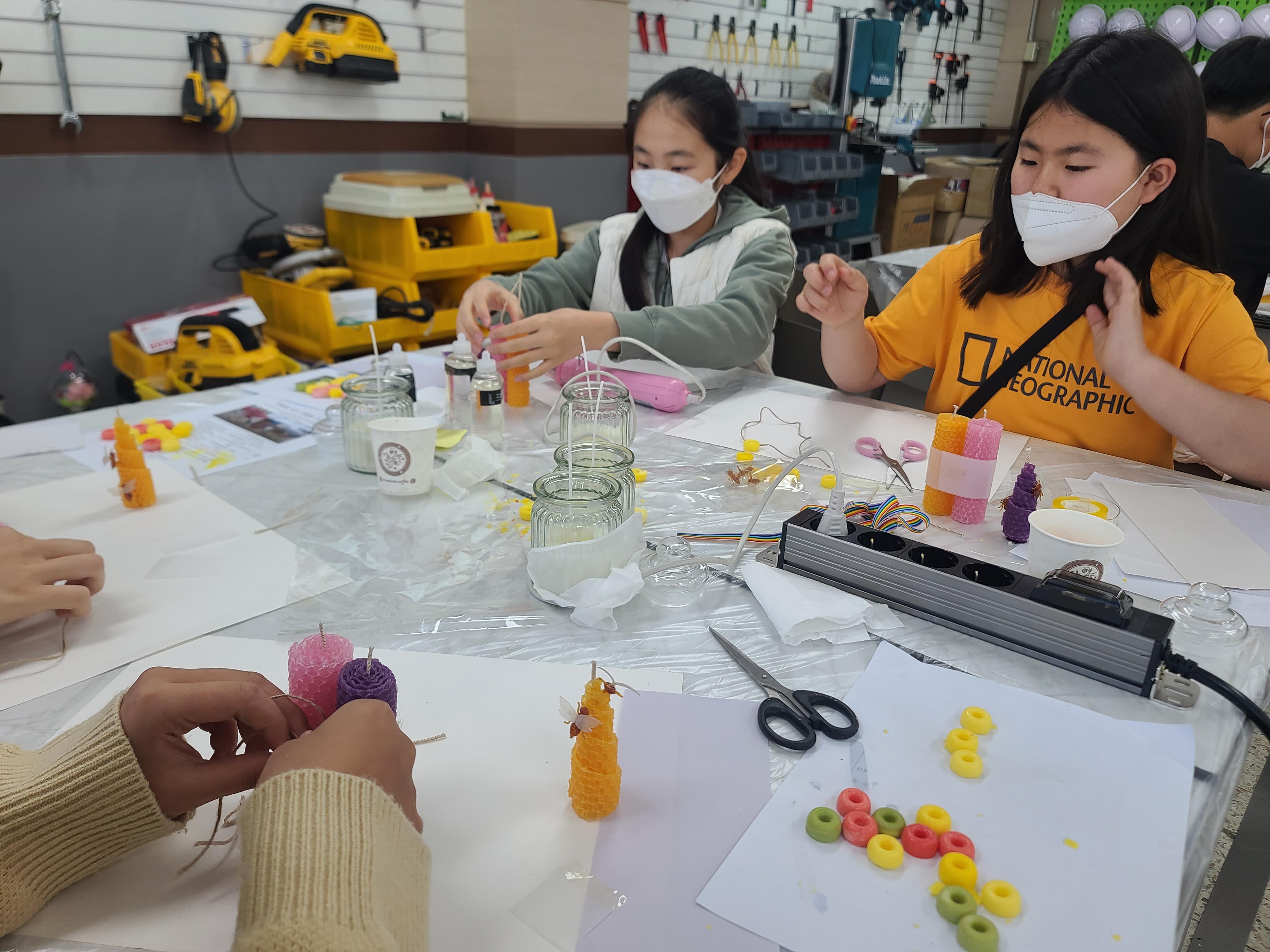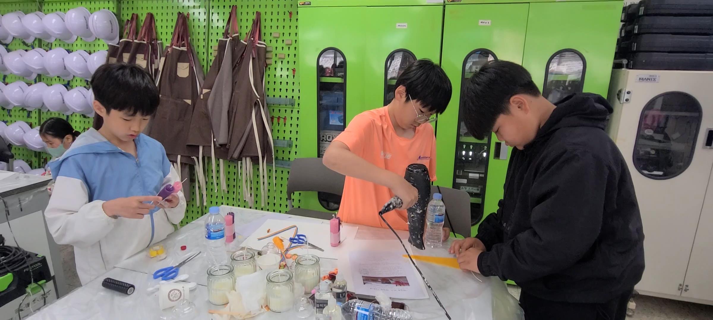 북부메이커교육센터에서는 2023년 4월부터 7월까지 월 1회 토요일 오전 ⌜토요 메이커교실⌟ 상반기 교육프로그램이 진행되며 오늘 수업 주제는‘디자인캔들 만들기’가 진행되었다. 학생들의 취향대로 양초 위의 토핑을 올려 캔들을 디자인하였으며 학생들은 밀랍을 재료로 사용하여 김밥처럼 둥글게 말아서 만드는 독특한 형태의 캔들도 만들었다. 추가적으로 디퓨저도 만들어보는 시간을 가졌다.