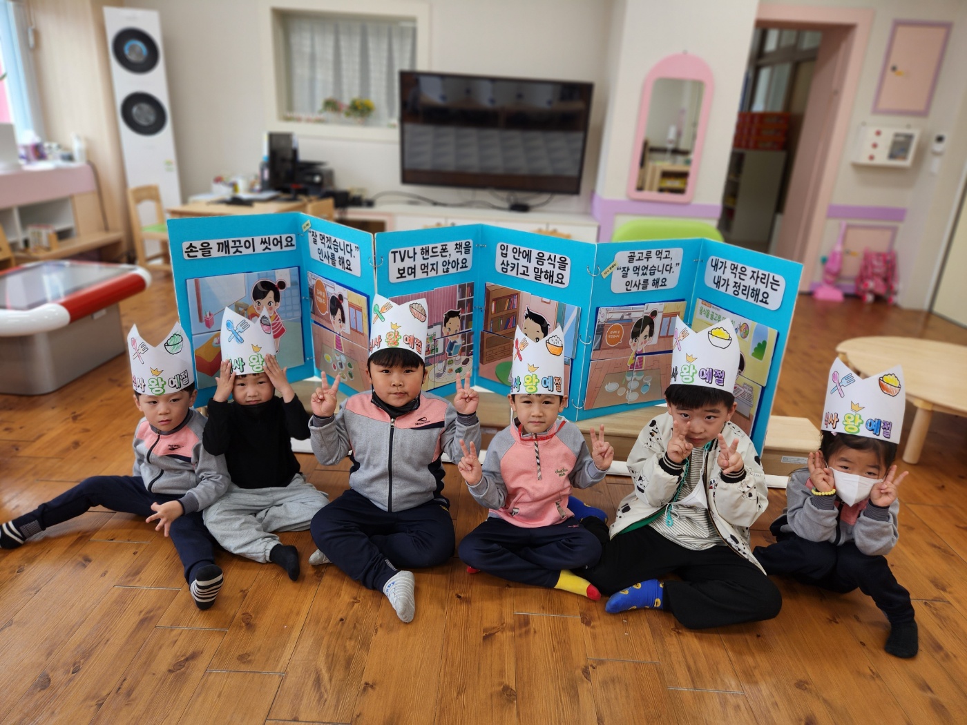 □ 동화를 듣고 동화내용으로 만든 큰 퍼즐 판을 이용하여 유아들이 한명씩 나와서 식사 예절에 대한 그림 퍼즐 맞추기를 해보았다. 유아들은 퍼즐의 그림 내용을 이야기하며 퍼즐을 하나씩 완성해 나갔다. 그리고는 식사 예절 왕 모자를 꾸며서 모자를 직접 착용하여 식사 예절 왕이 되어보자고 스스로 다짐하며 약속하였다.
