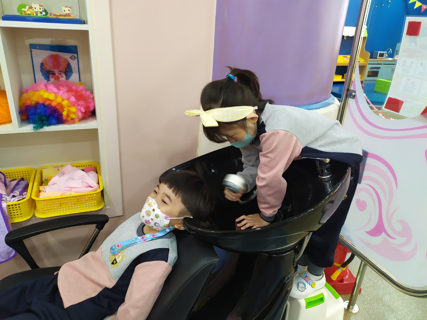 □ 먼저 유아들은 안전하게 놀이하기 위한 약속들을 이야기 나누고 표현누리방에서 체험활동을 진행하였다. 자동차를 타며 캠핑 가자고 이야기하기도 하며 그릴 놀잇감에 음식 모형을 구워서 친구와 나누어 먹기도 하였다 소리나라에서는 유치원 원가를 부르며 다양한 악기를 연주해보기도 하였고, 연지곤지방에서 미용사가 되어 친구들을 아름답게 꾸며주기도 하며 웃음이 가득한 체험 시간을 보냈다.