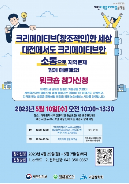 [금요저널] 대전시는 오는 5월 10일 오전 10시부터 대전 소통협력공간 1층 모두모임방에서 ‘2023년 대전지역문제해결플랫폼’ 오프라인 의제발굴 워크숍을 개최한다고 밝혔다.