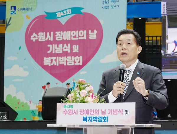 수원시가 장애인의 날을 맞아 25일 수원체육관에서 연 ‘제43회 장애인의 날 기념식’에 참석한 이재준 시장은 “장애인 정책을 세심하게 수립해 차별 없는 사회를 만들어 나가겠다”며 “사회 구성원 모두가 동행할 수 있도록 여러분과 함께하겠다”고 말했다.