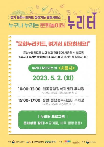 [금요저널] 시흥시는 문화누리카드 이용자의 편의 도모를 위해 경기문화재단과 협업해 오는 5월 2일 찾아가는 문화서비스 ‘누리터’를 월곶동 행정복지센터와 정왕1동 행정복지센터에서 운영한다.