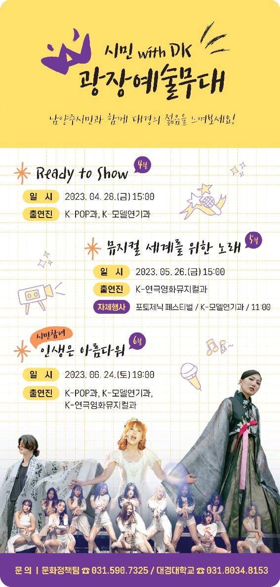 4월부터 6월까지 매월 마지막 주에 개최되는 ‘DK 예술무대’는 남양주시와 남양주시 진접읍에 소재한 대경대학교가 함께하는 협력사업으로 그간 코로나19로 인해 침체됐던 문화예술 향유와 더불어 예비 예술인인 예술전공 대학생에게 다양한 무대의 장을 제공하기 위해 기획됐다.