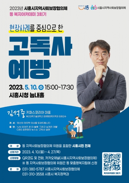 강연 신청은 홍보 포스터의 QR코드 또는 카카오톡 플러스친구로 가능하며 궁금한 사항은 시흥시지역사회보장협의체 사무국 또는 시흥시청 복지정책과로 문의하면 된다.