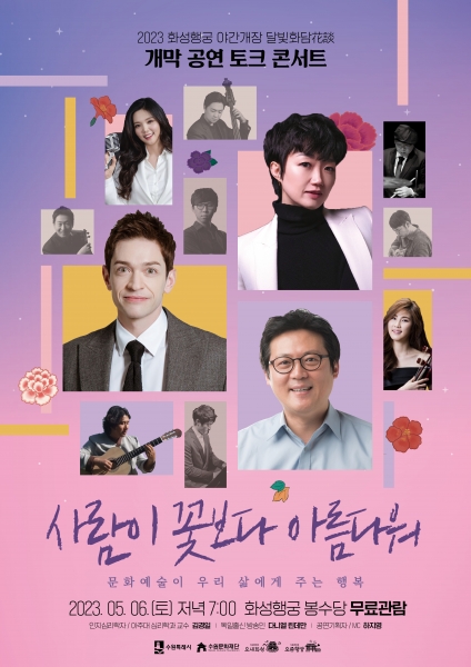 어린이날 연휴에 연이은 5월 6일 토요일 저녁 7시에는 2023년 화성행궁 야간개장을 본격적으로 알리는 개막공연인 토크 콘서트 ‘사람이 꽃보다 아름다워’가 화성행궁 봉수당에서 무료로 개최한다.