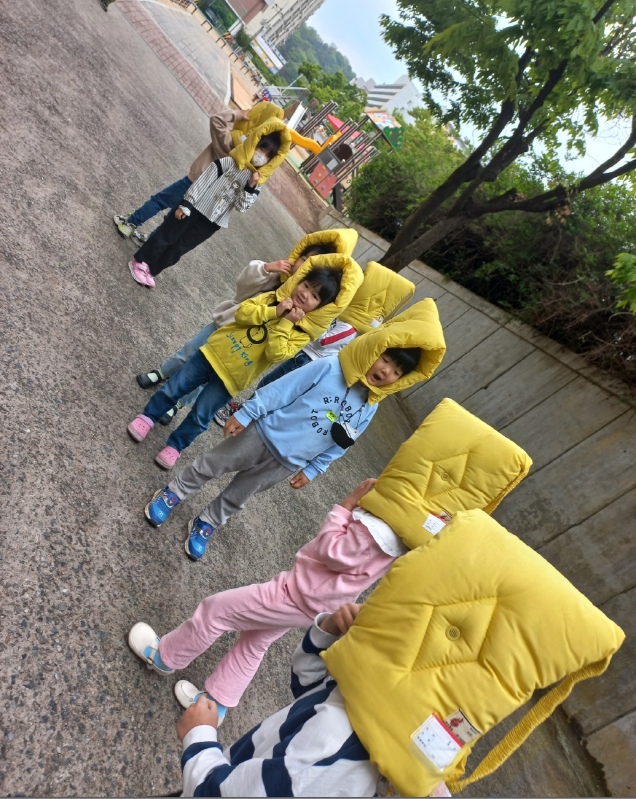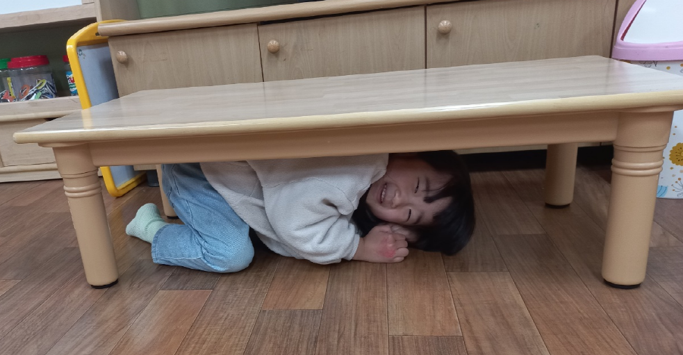▣ 대피훈련에 앞서 교실에서 지진대피훈련 동영상 시청 및 이야기나누기를 통해 유아가 이해하기 쉽도록 사전교육을 실시하였다. 지진발생 사이렌이 울리자 교사들의 안내에 따라 유아들은 책상 밑으로 들어가 몸을 보호하였고, 사이렌 소리가 멈추자 지진대피모자를 착용 후 대피경로에 따라 건물 밖 대피장소로 안전하게 대피하였다.